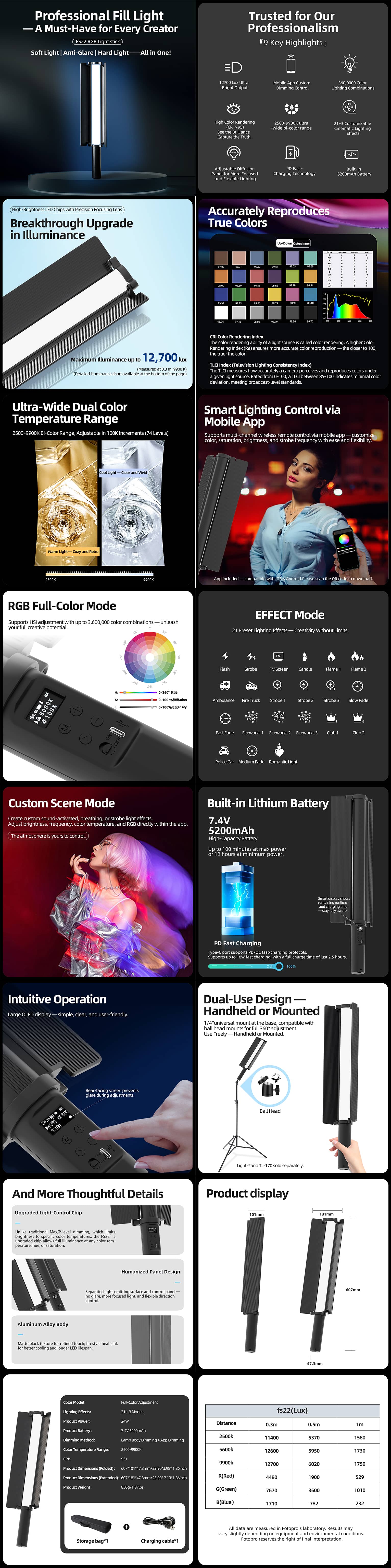 The Fotopro FS22 RGB Light stick is a versatile fill light designed for creators. It combines soft, anti-glare, and hard lighting in one compact device. With 12,700 lux brightness, 95+ CRI, and 2500-9900K bi-color tuning, it delivers professional color accuracy. Features include 3.6 million RGB colors, 21+ lighting effects, app control, and a 5200mAh battery for up to 12 hours of use. Its portable design with a 1/4″ mount supports handheld or studio setups, making it perfect for photography and videography.