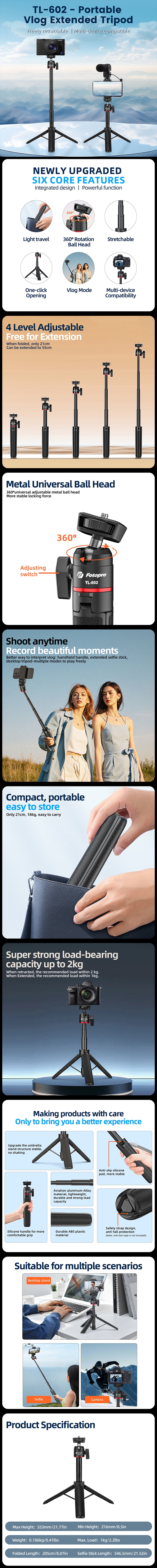 The TL-602 is a compact, all-in-one tool for creators. It folds to just 8.1in/0.41lbs for ultimate portability and extends to 21.8in.
