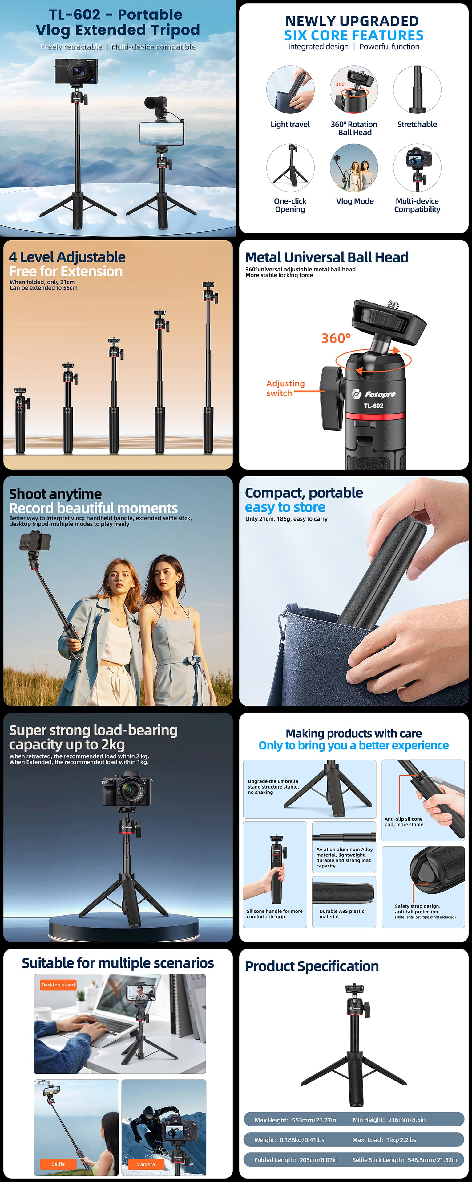 The TL-602 is a compact, all-in-one tool for creators. It folds to just 8.1in/0.41lbs for ultimate portability and extends to 21.8in.